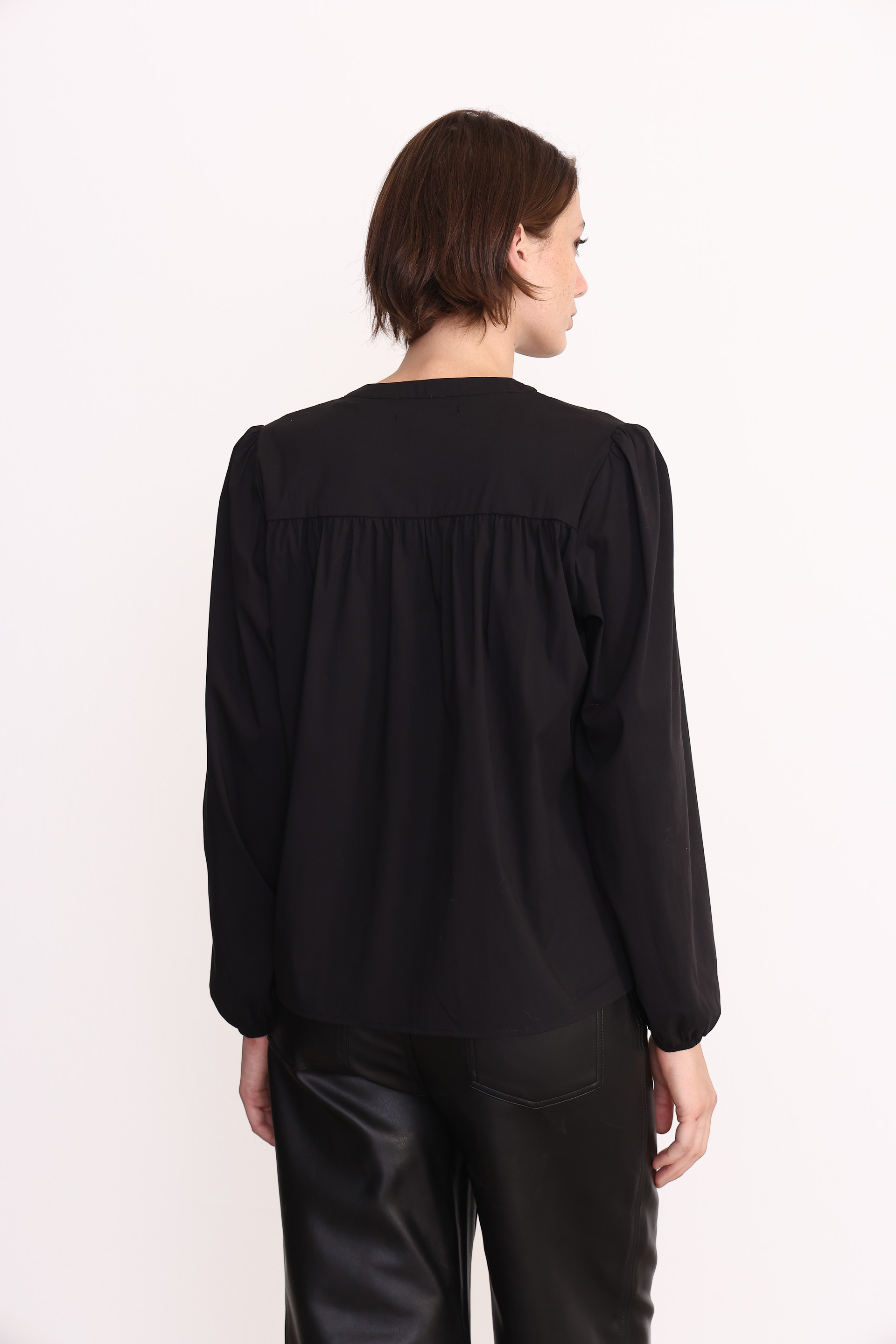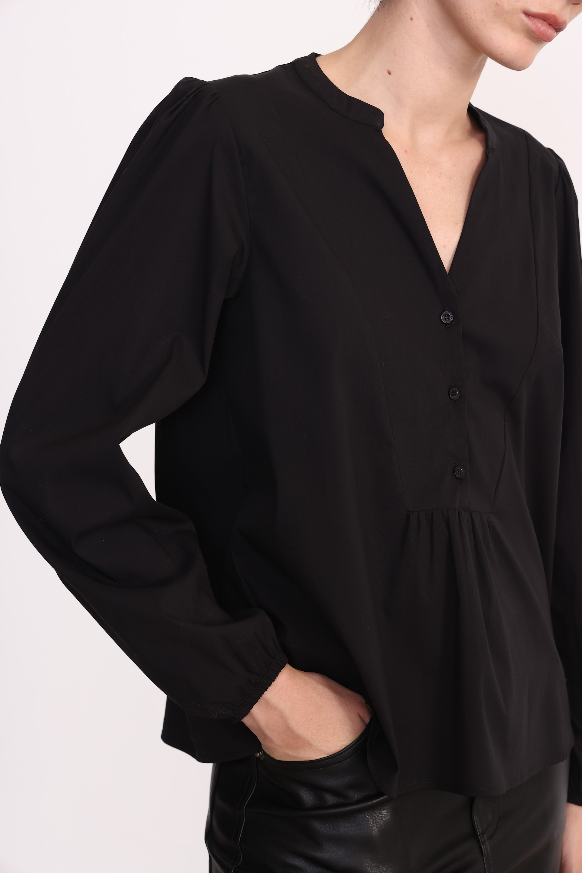 Blusa escote v con recorte en cintura, confeccionada en poplin de algodón elastizado. La modelo esta usando talle 42.