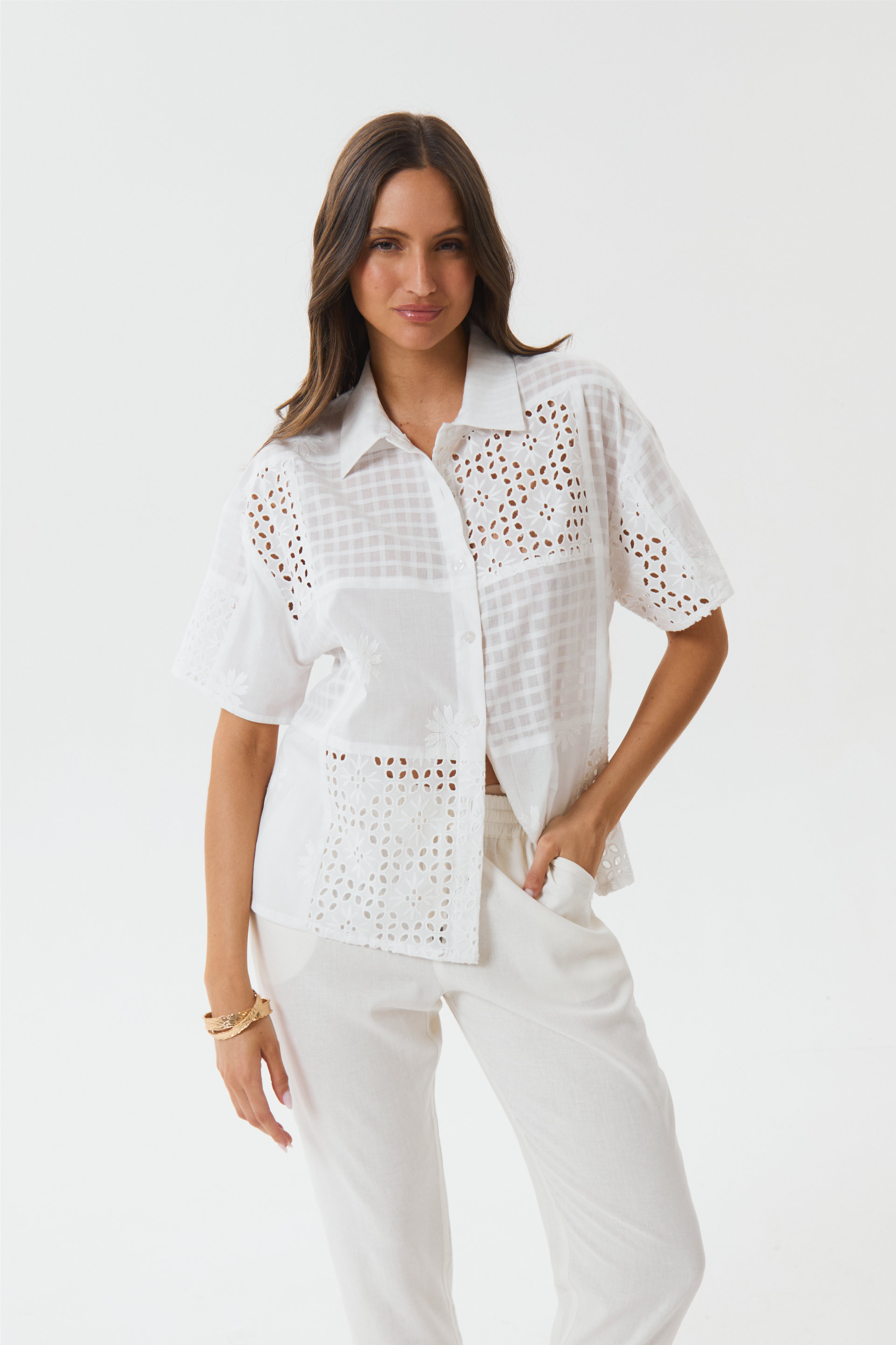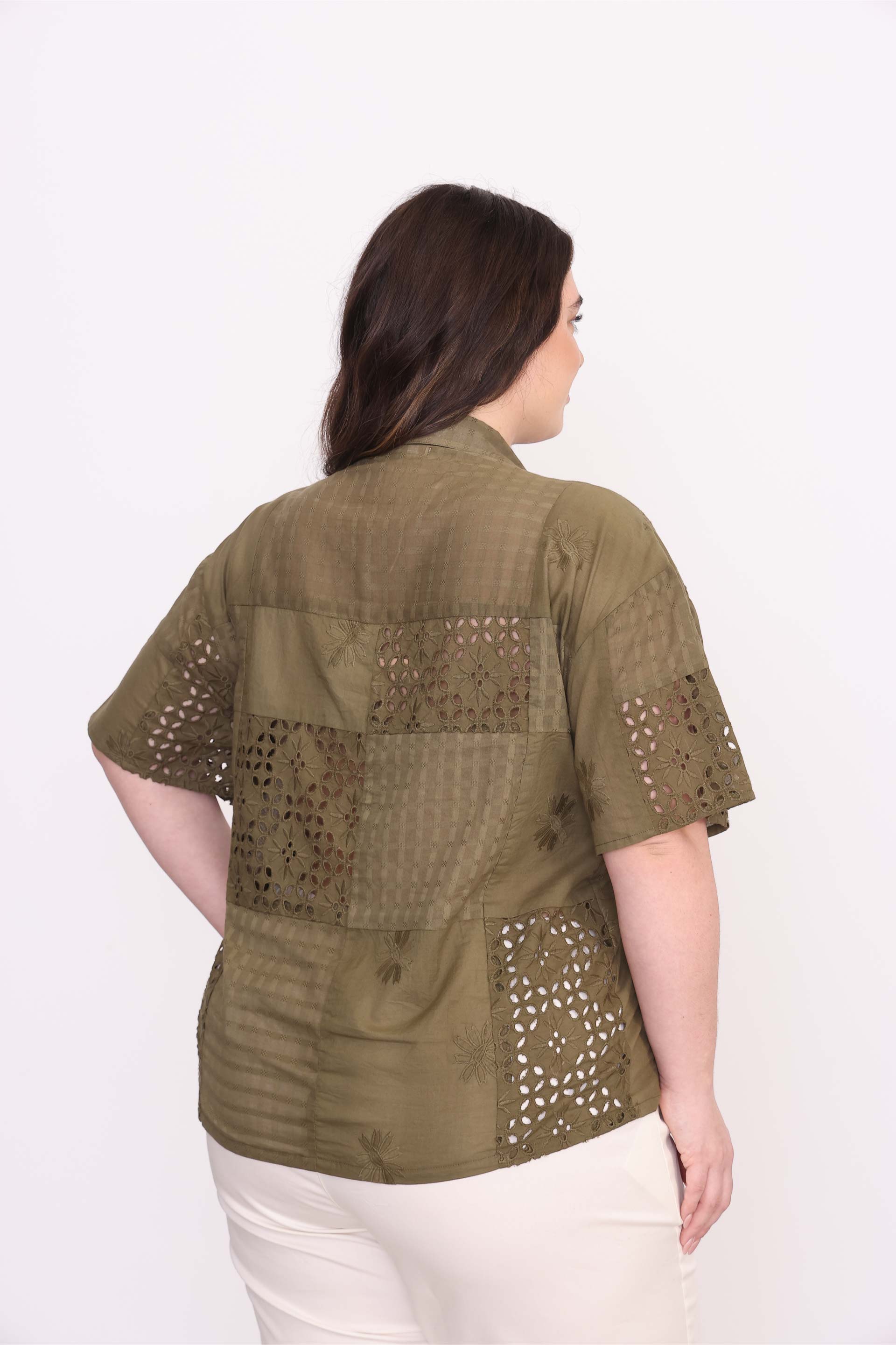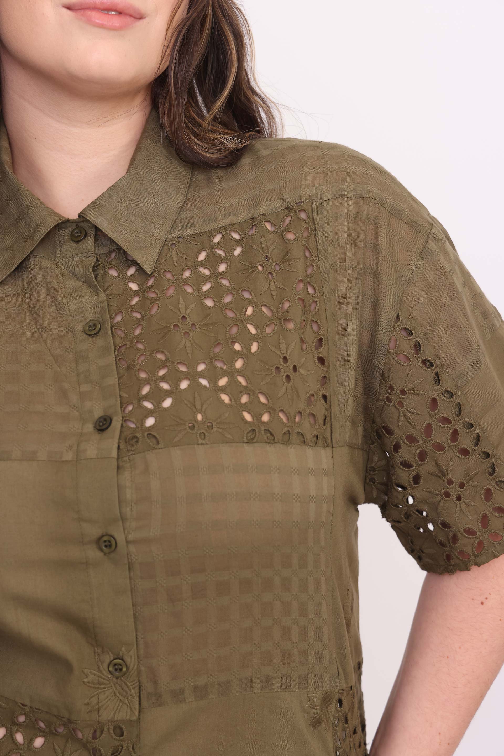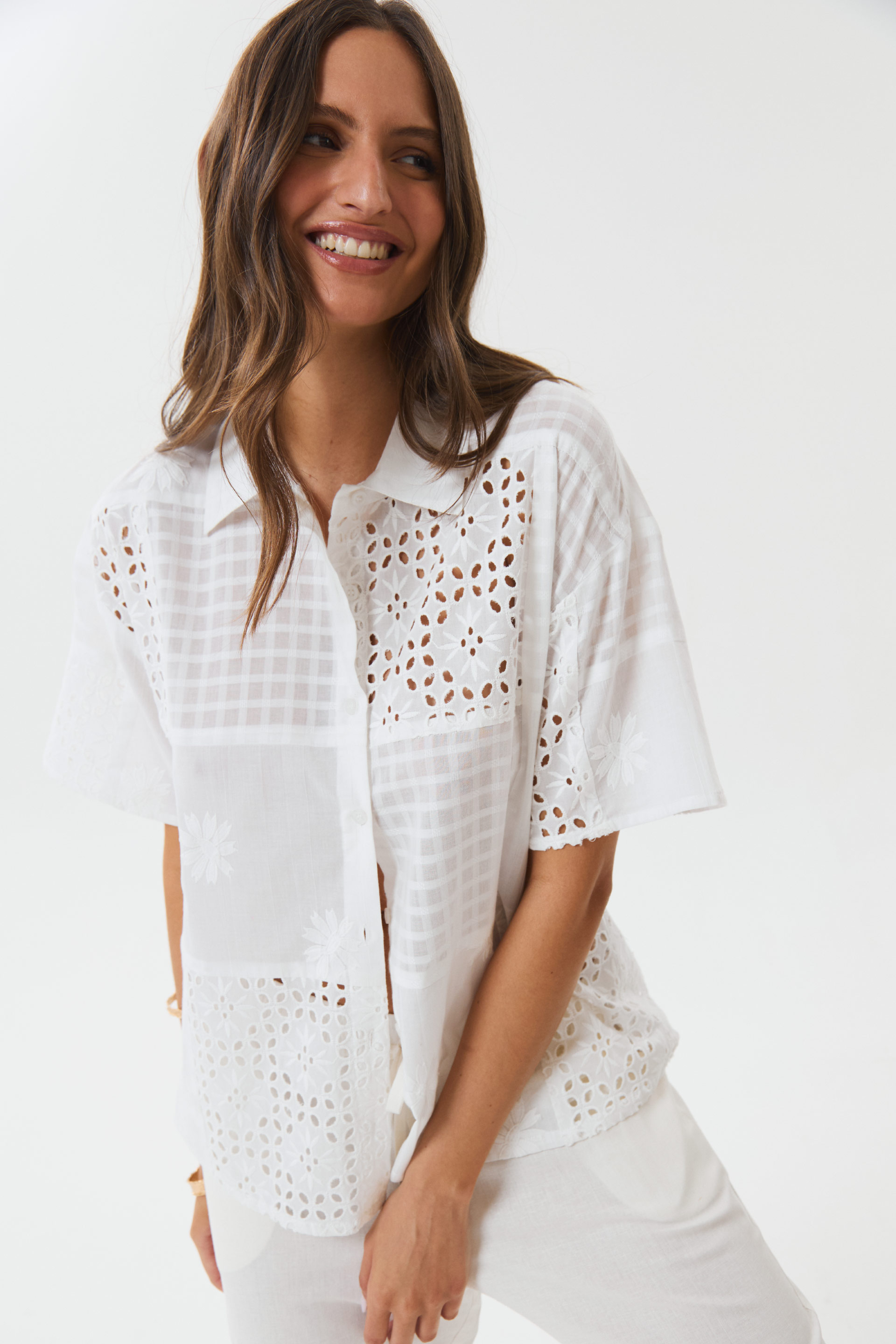Camisa con recortes de broderie, confeccionada en 100% algodón. La modelo está usando talle 42