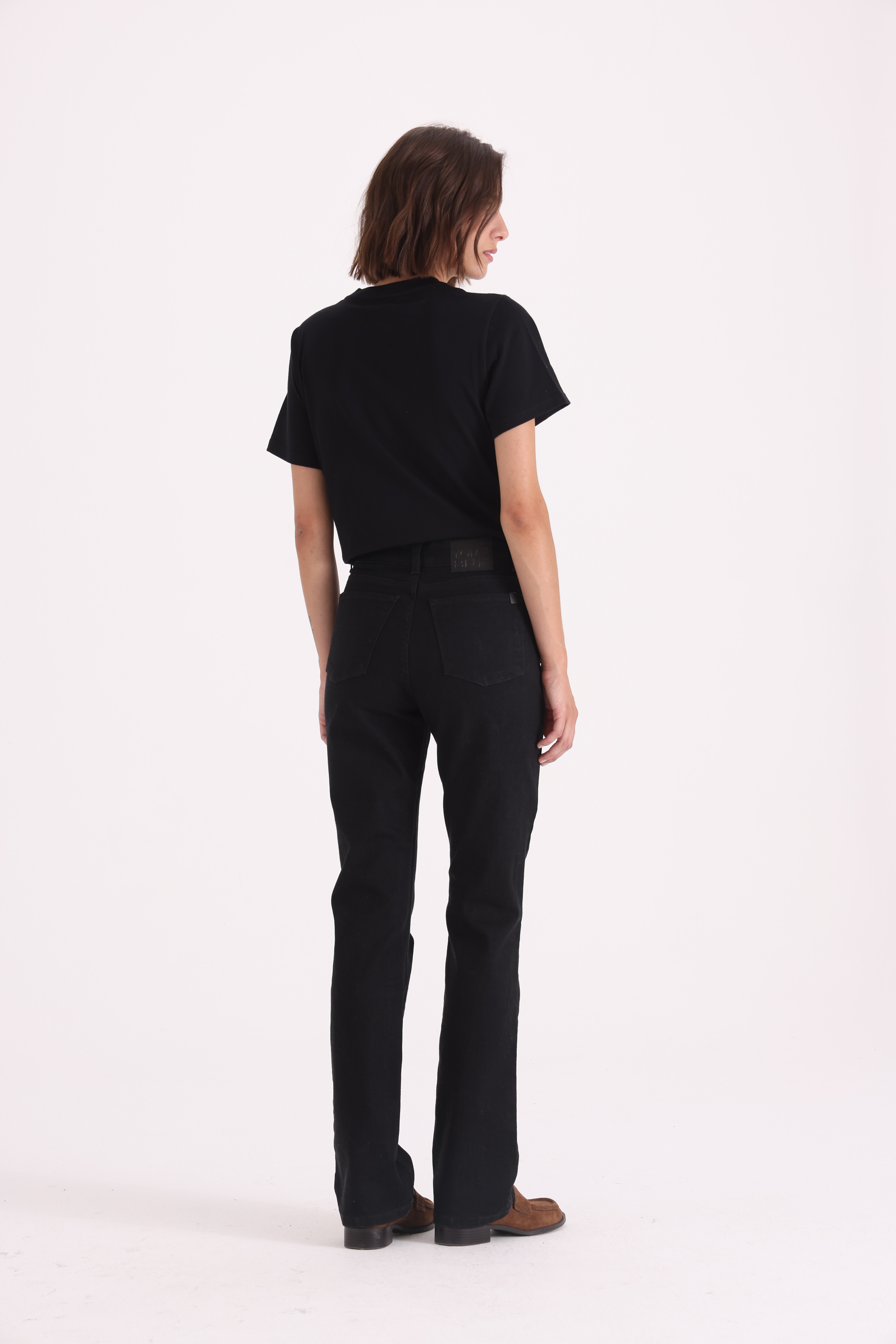 Jean clásico ALEXA de tiro medio en denim elastizado. Lavado black acid, con bolsillos delanteros y traseros. Producción propia, calce cómodo y versátil. La modelo usa talle 26.