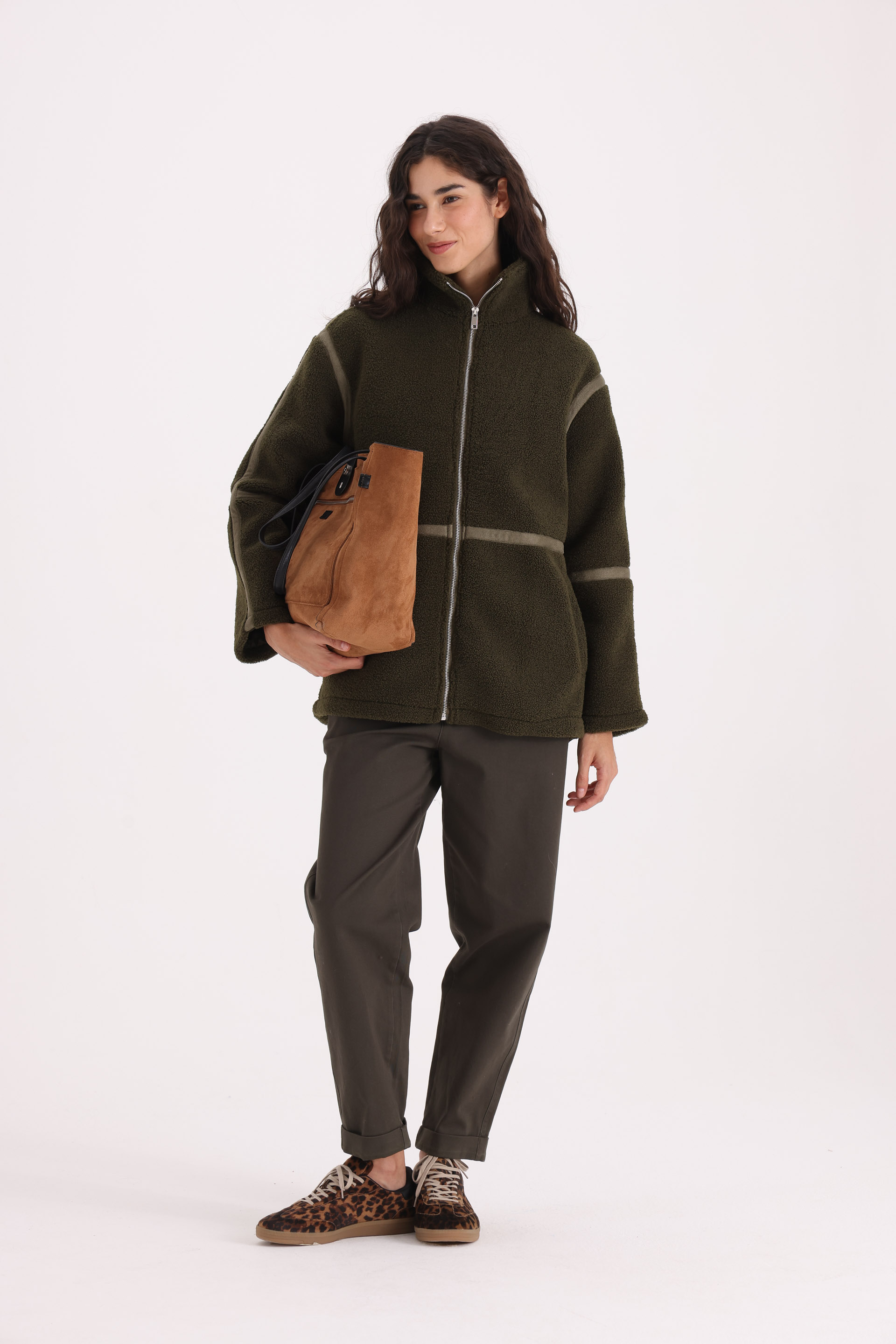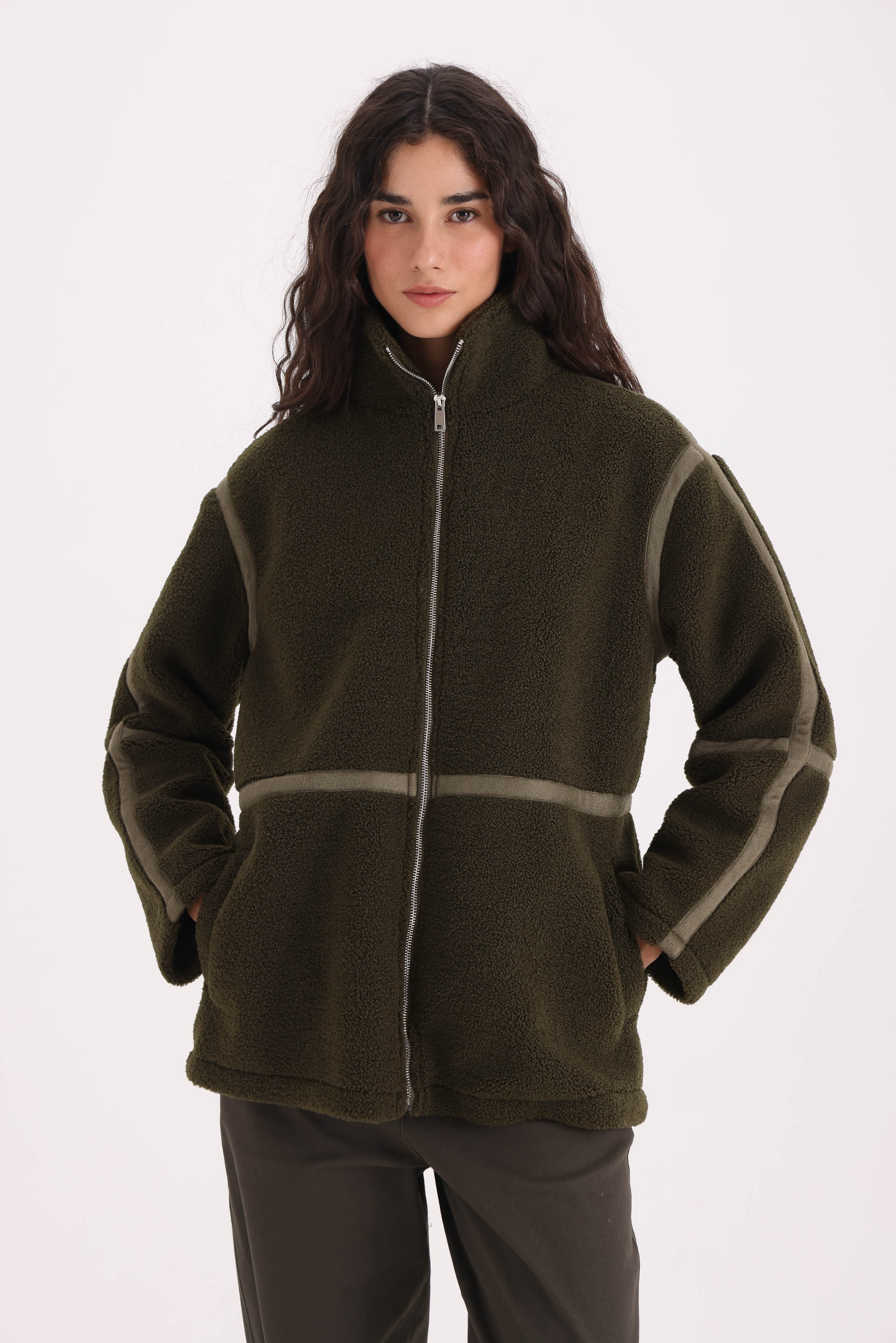 Calce: la silueta cae de forma cómoda sobre el cuerpo, sin ajustar. El largo a la cadera ayuda a equilibrar la figura y permite usarlo abierto o cerrado con facilidad.