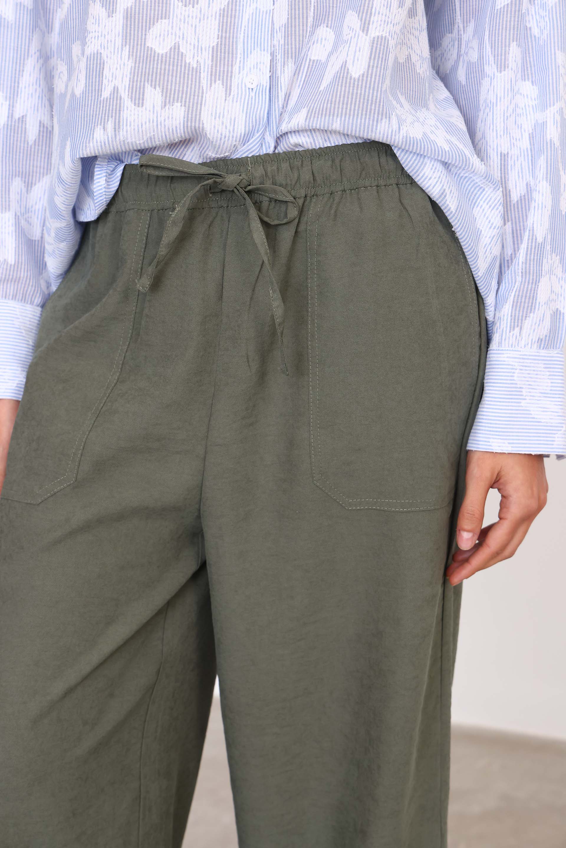 Pantalón wide leg con cintura elastizada y cordón de ajuste. Cuenta con bolsillos laterales y plaqué en delantero. La modelo está usando talle 42